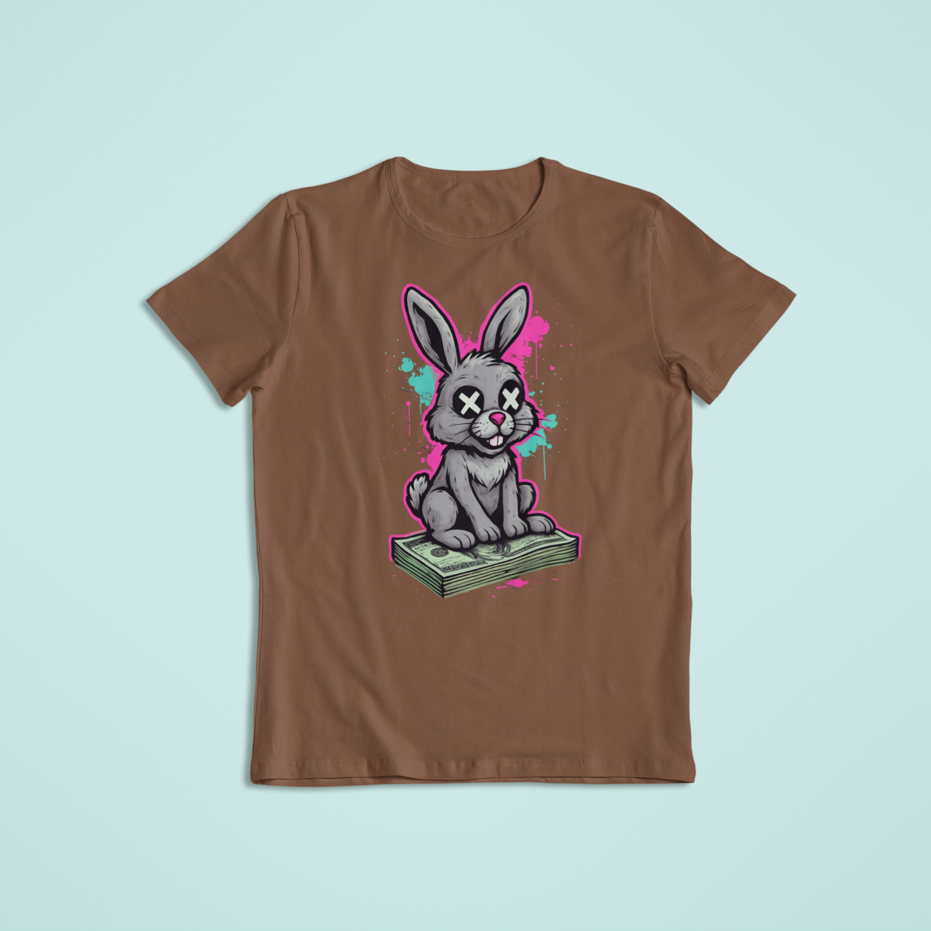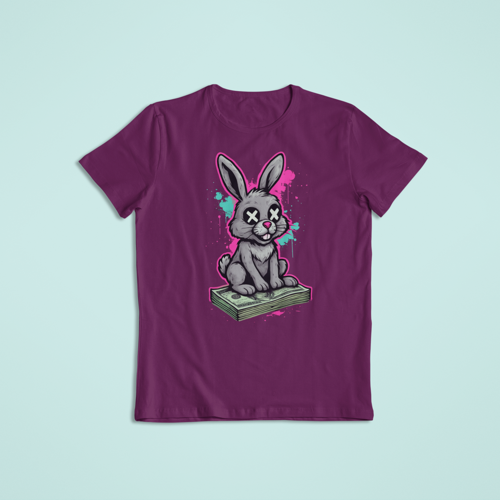Turn heads with this bold and edgy design featuring a mischievous bunny sitting on a stack of cash! The cartoon-style bunny with X eyes pops against a splash of neon pink and teal graffiti paint — perfect for anyone who loves street art, humor, and bold fashion.