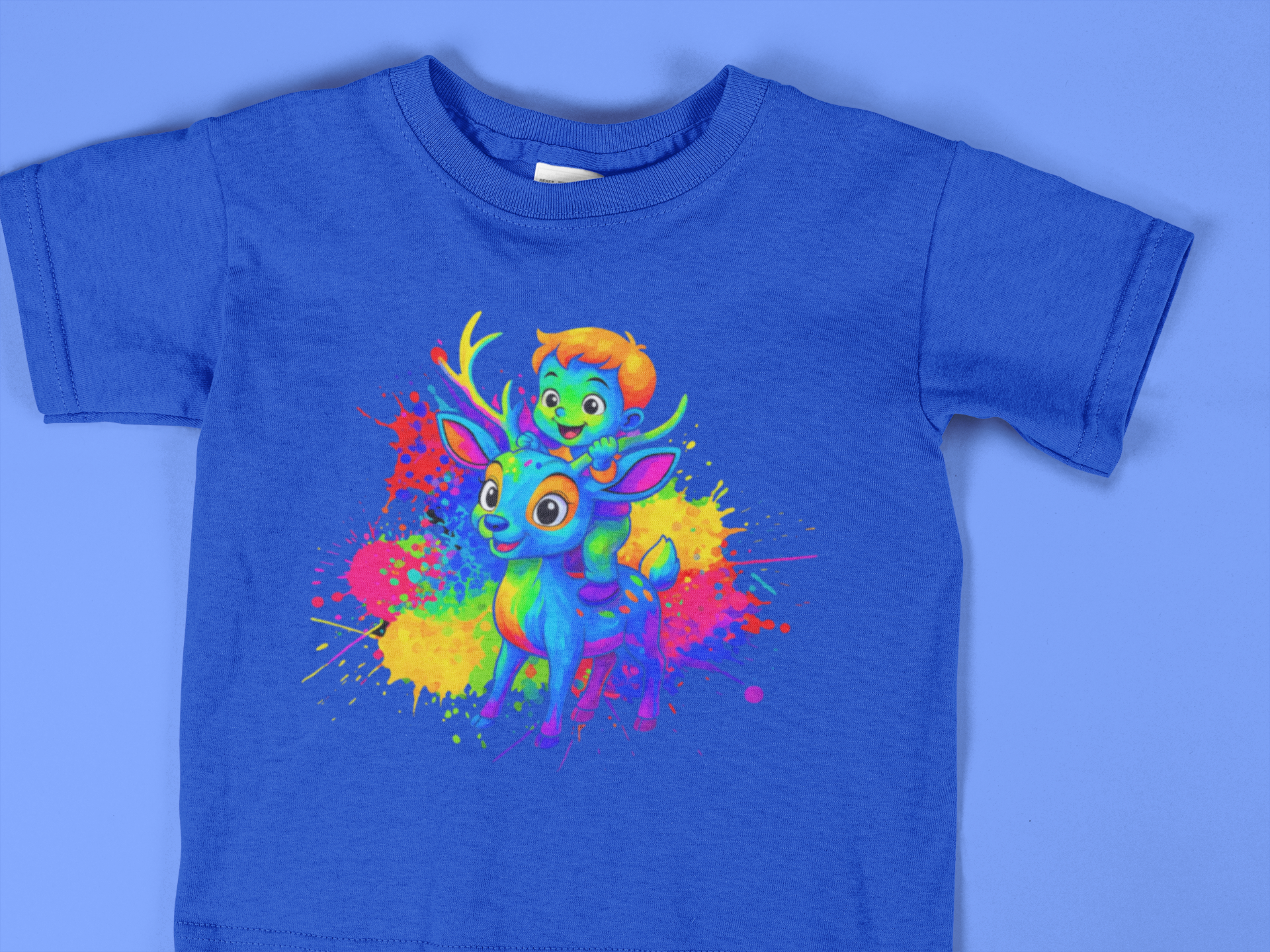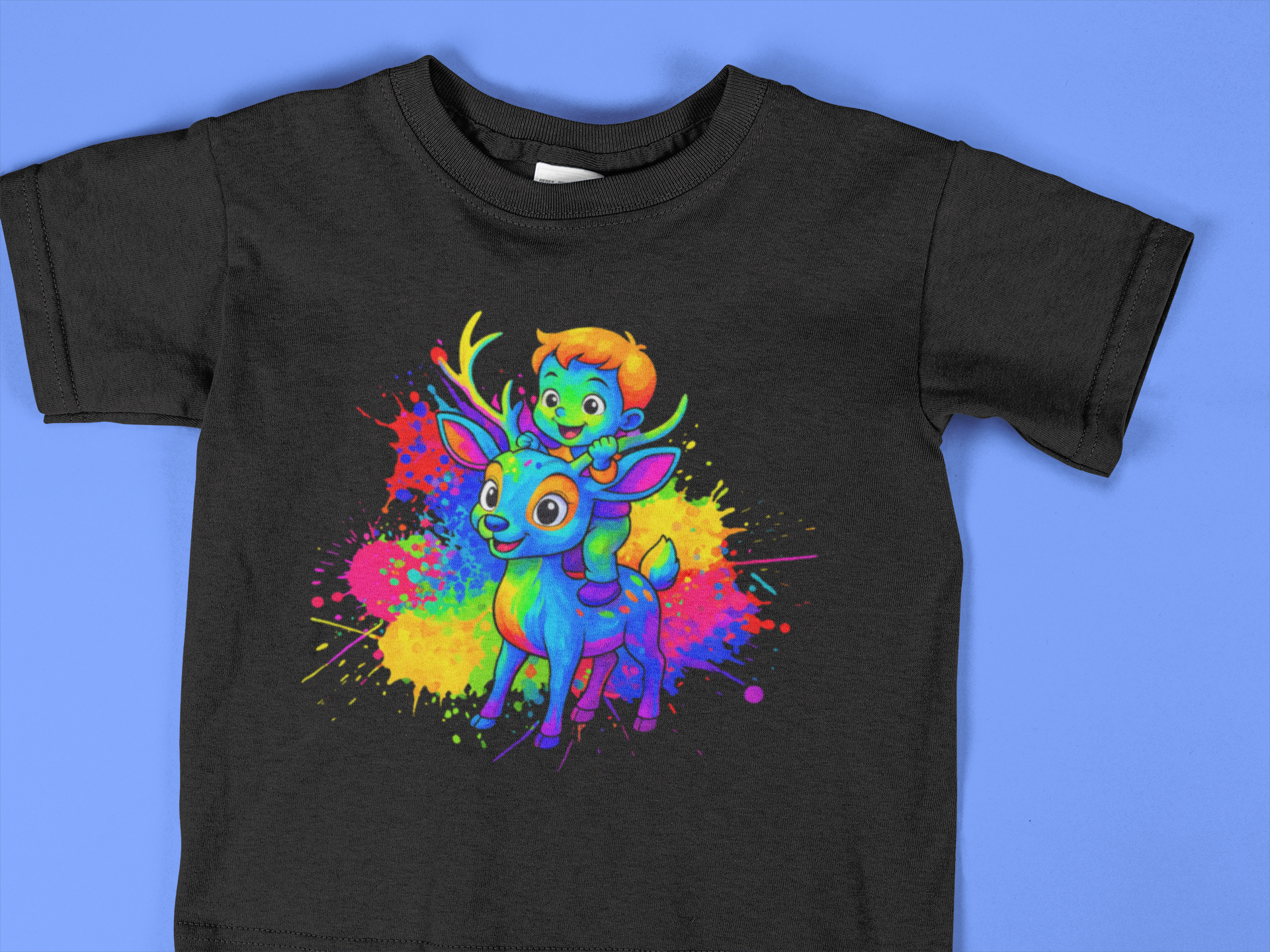 Let your little one step into a world of imagination with this adorable Colorful Deer Adventure toddler shirt! Featuring a happy cartoon child riding a friendly deer against a bright splash-paint background, this design is full of fun, color, and magic — perfect for curious toddlers who love animals and adventure.