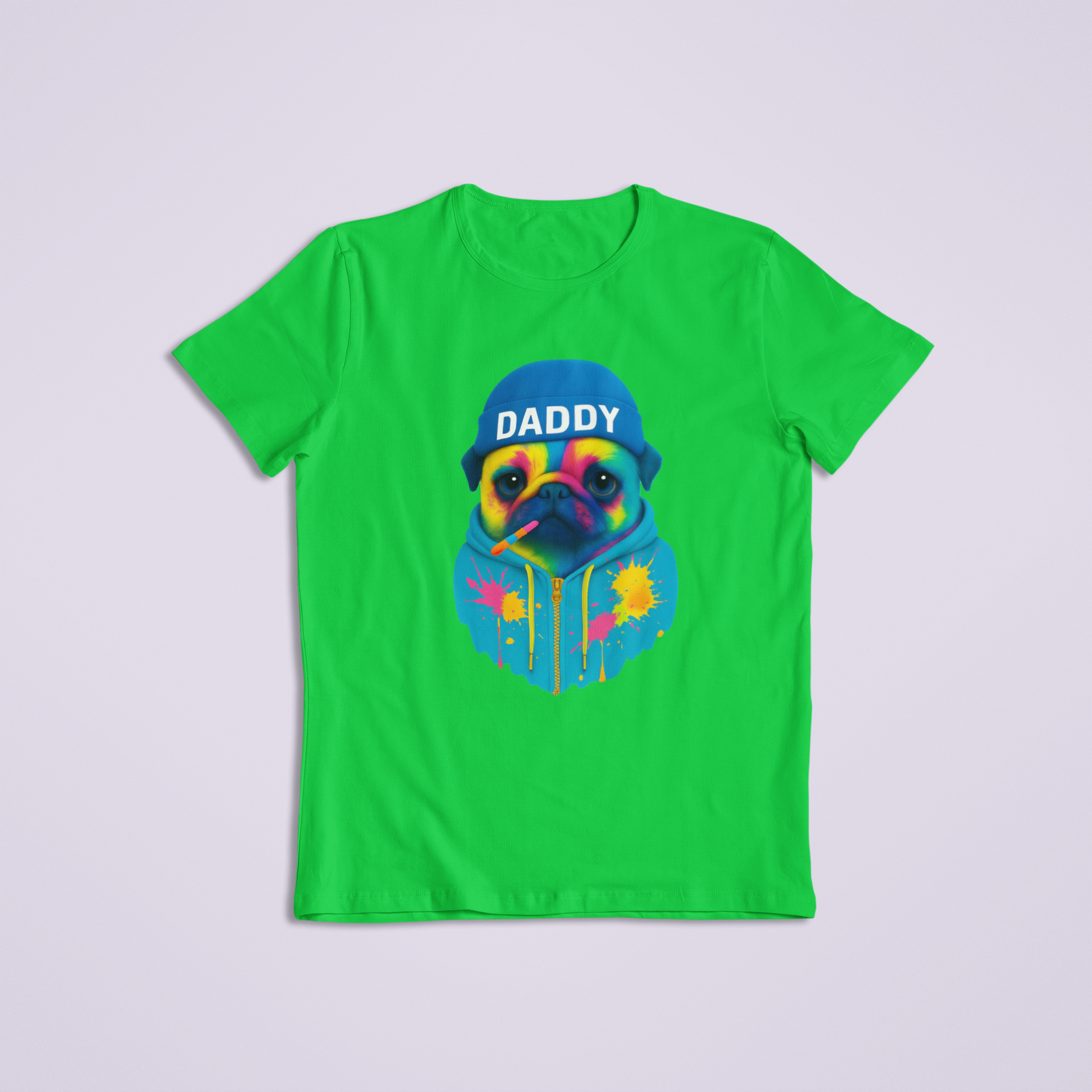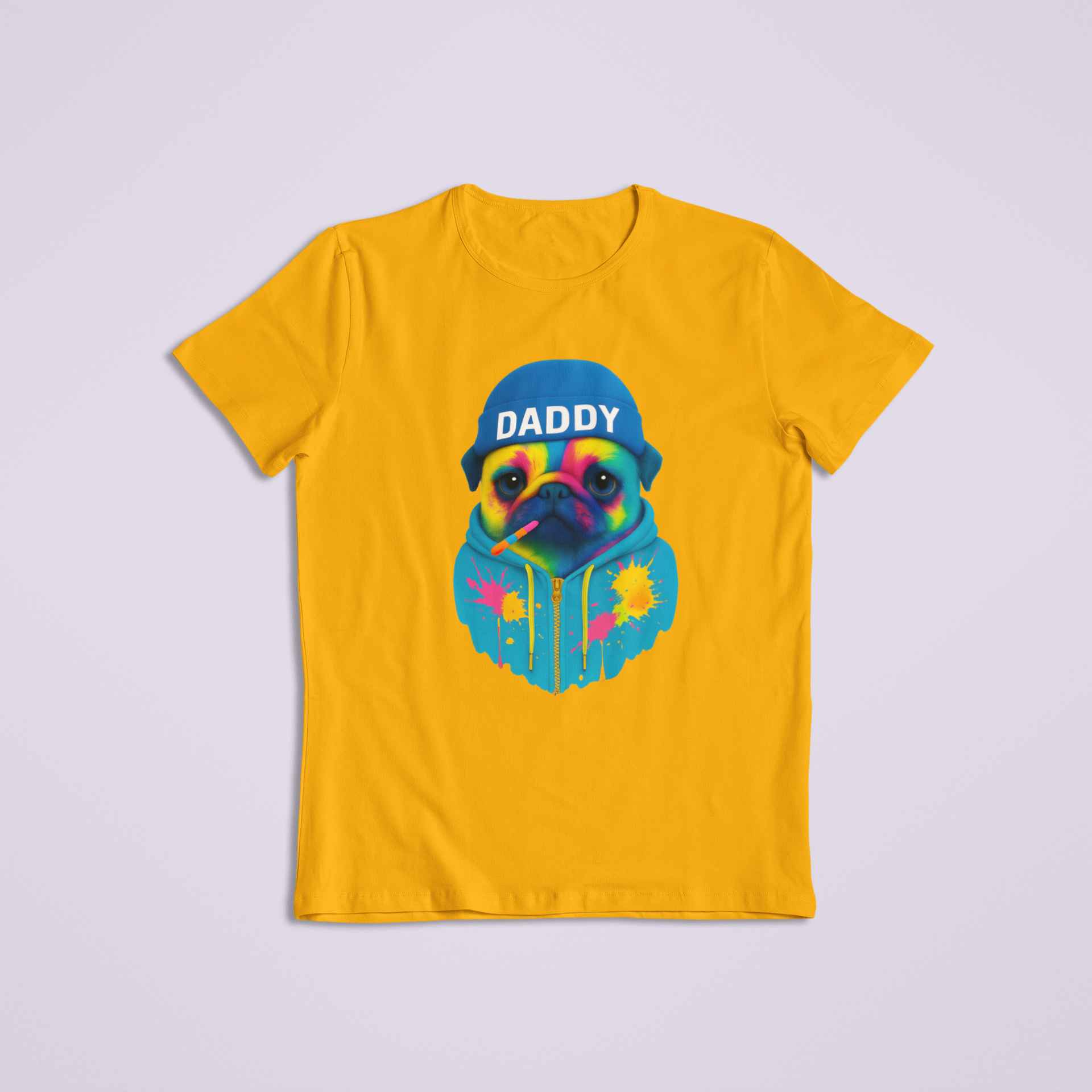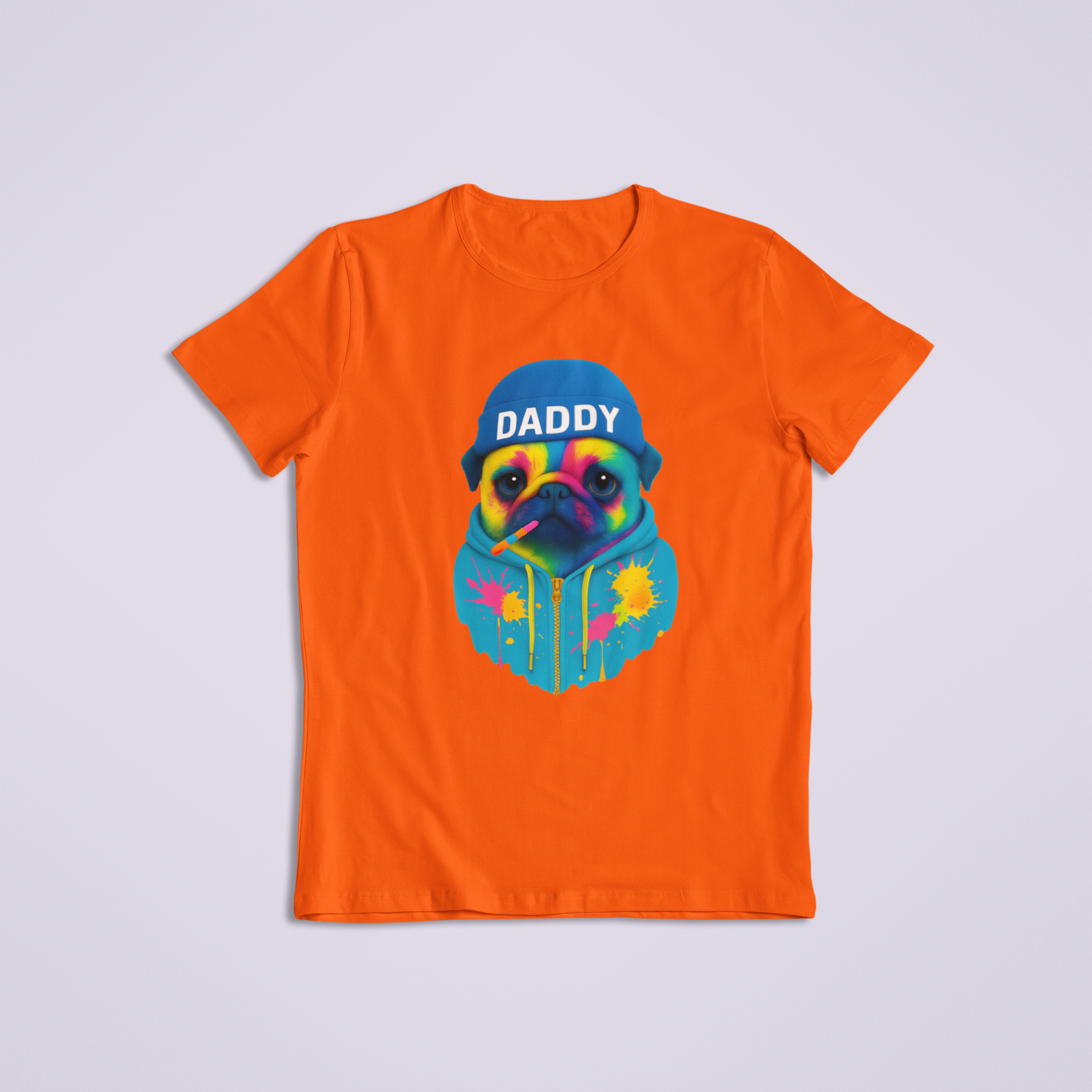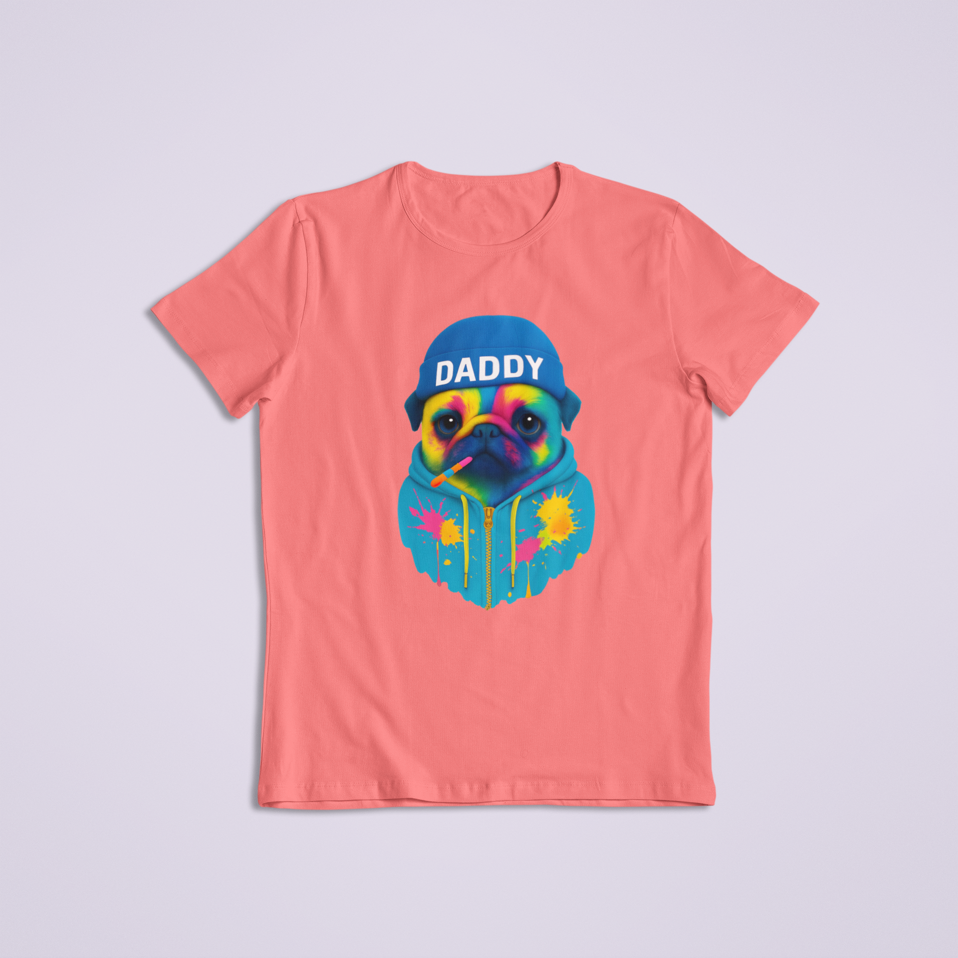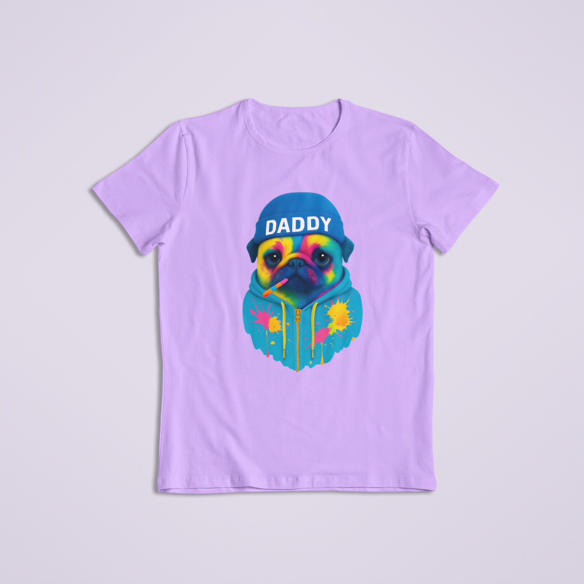 Unleash bold personality and unbeatable style with our Colorful Daddy Pug T-shirt and hoodie! This eye-catching design features a vibrantly painted pug wearing a beanie labeled “DADDY,” rocking a cool hoodie splattered with bright neon paint. With a chill vibe and confident expression (plus a rainbow-striped popsicle in its mouth), this pug brings just the right mix of attitude and adorable.