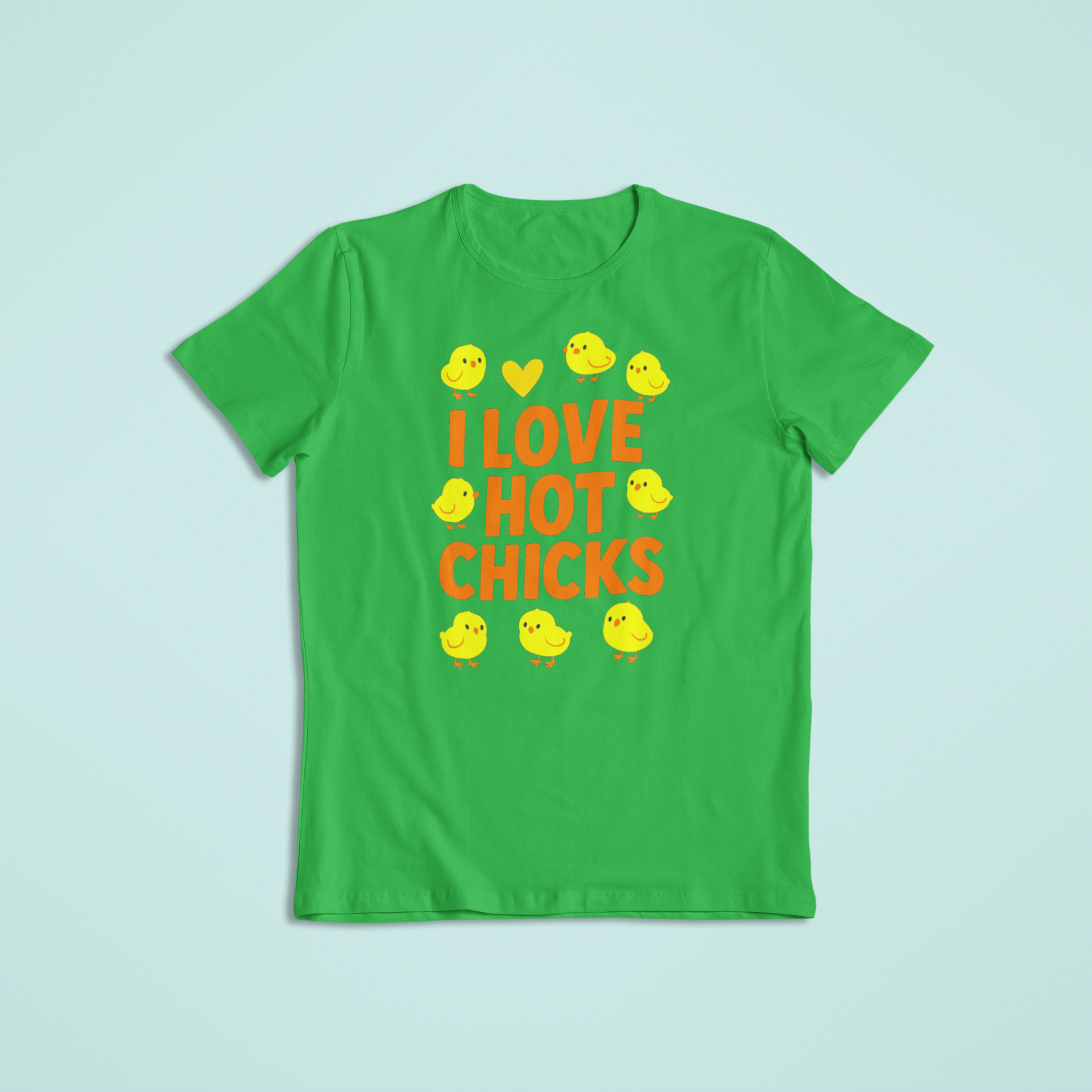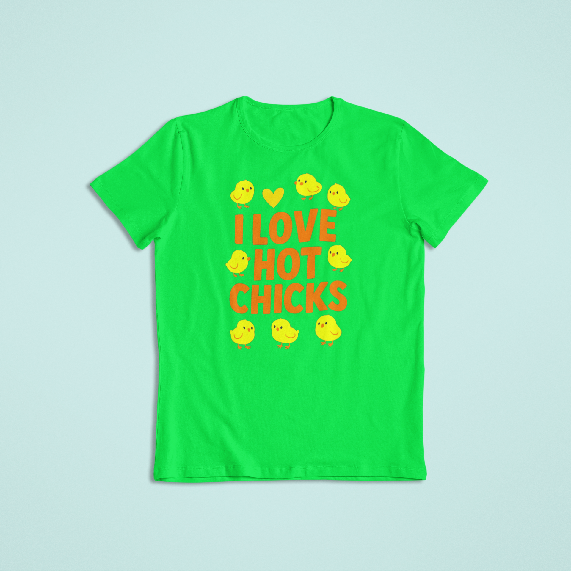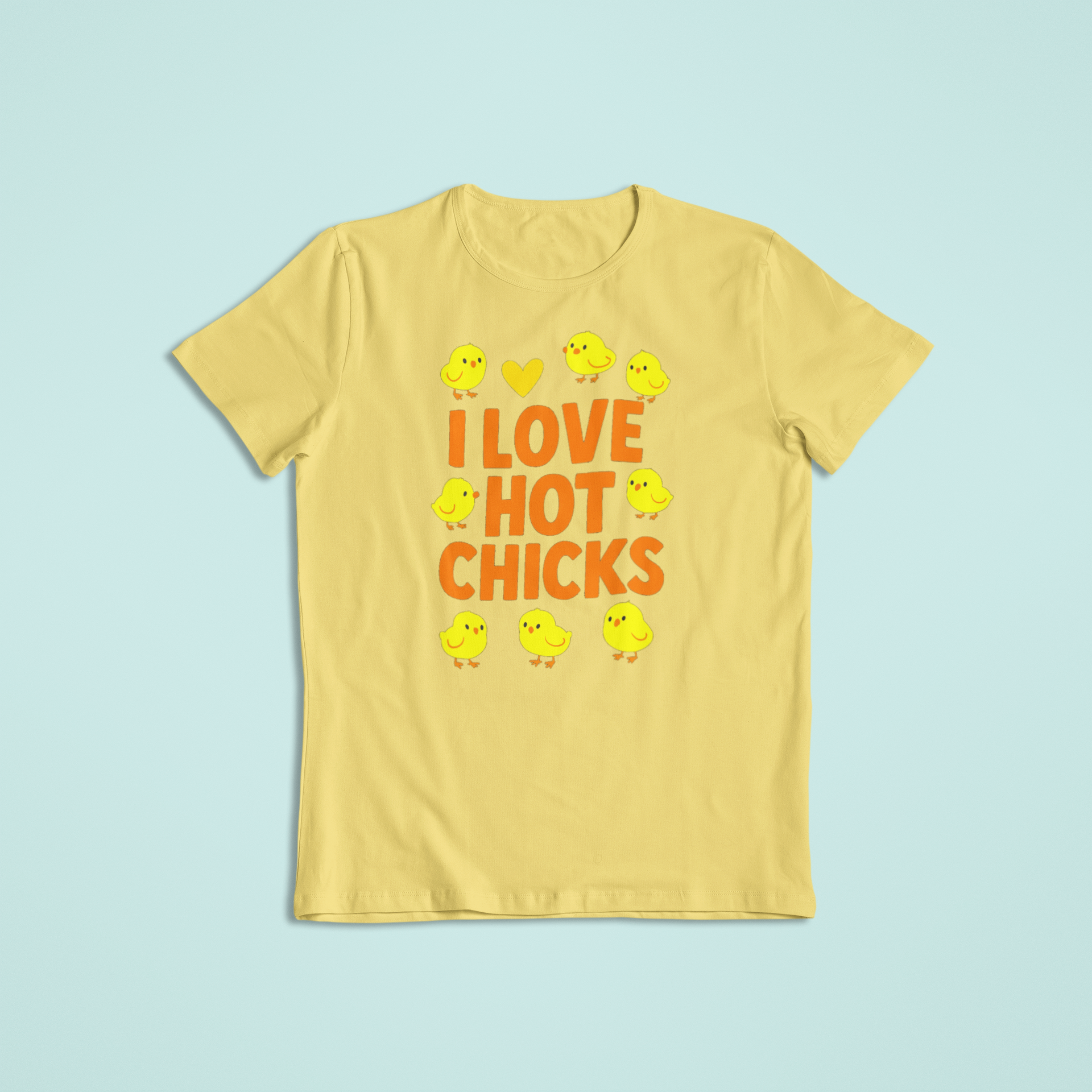 This playful and cheeky T-shirt design features the bold, eye-catching phrase “I Love Hot Chicks” in large, vibrant orange lettering centered on a solid black background. Surrounding the text are multiple adorable yellow cartoon chicks with sweet expressions, adding a fun and humorous double meaning to the message. A bright yellow heart above the word "LOVE" enhances the affectionate and light-hearted tone of the design.