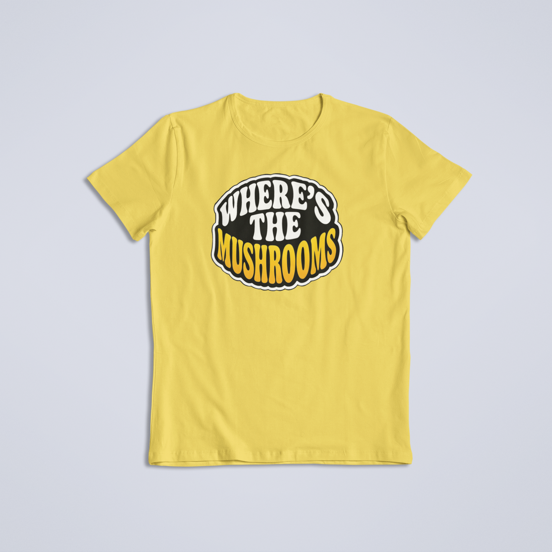 The top portion of the text—“Where’s The”—is in clean white, drawing attention and setting up the punchline. “Mushrooms,” in a vibrant golden-yellow gradient, pops against the black background, mimicking a sunshine-soaked glow that complements the psychedelic style. The color palette combined with the wavy lettering creates a playful energy that’s both nostalgic and contemporary.