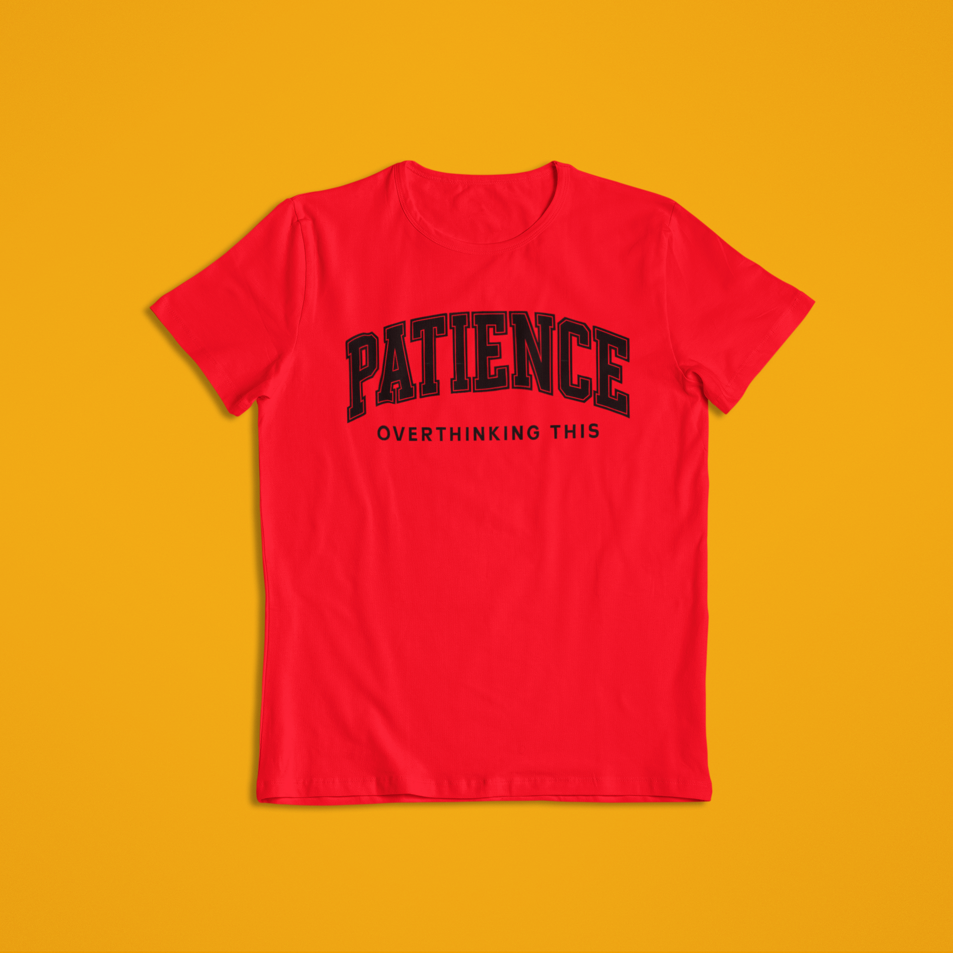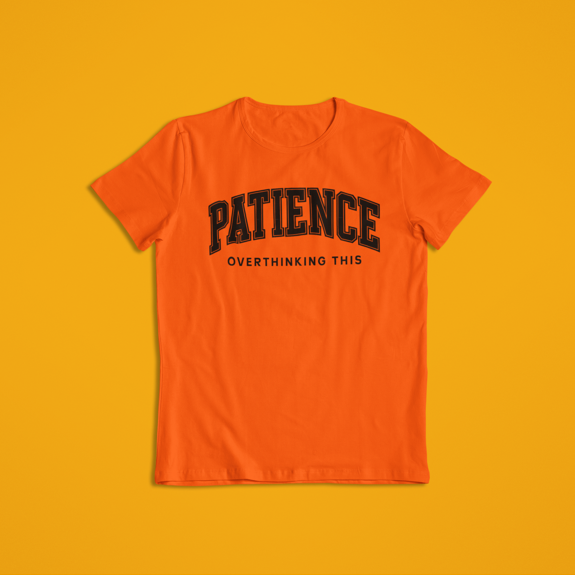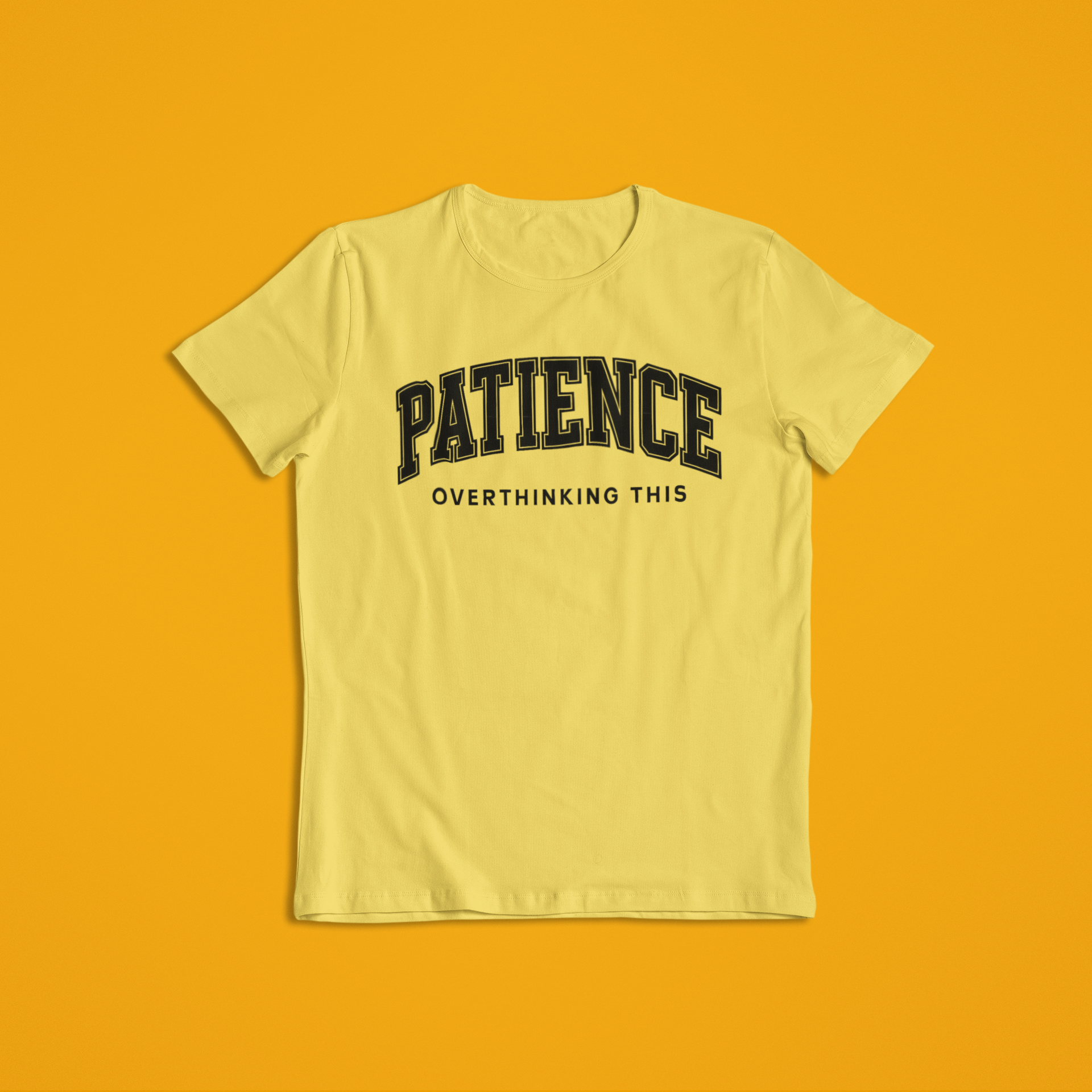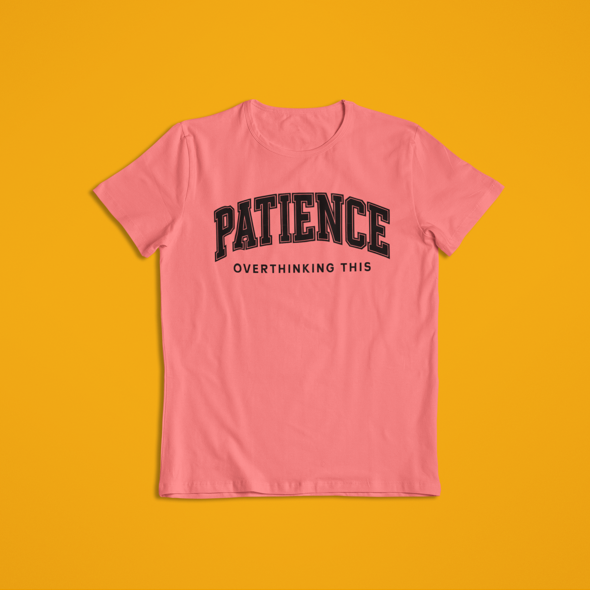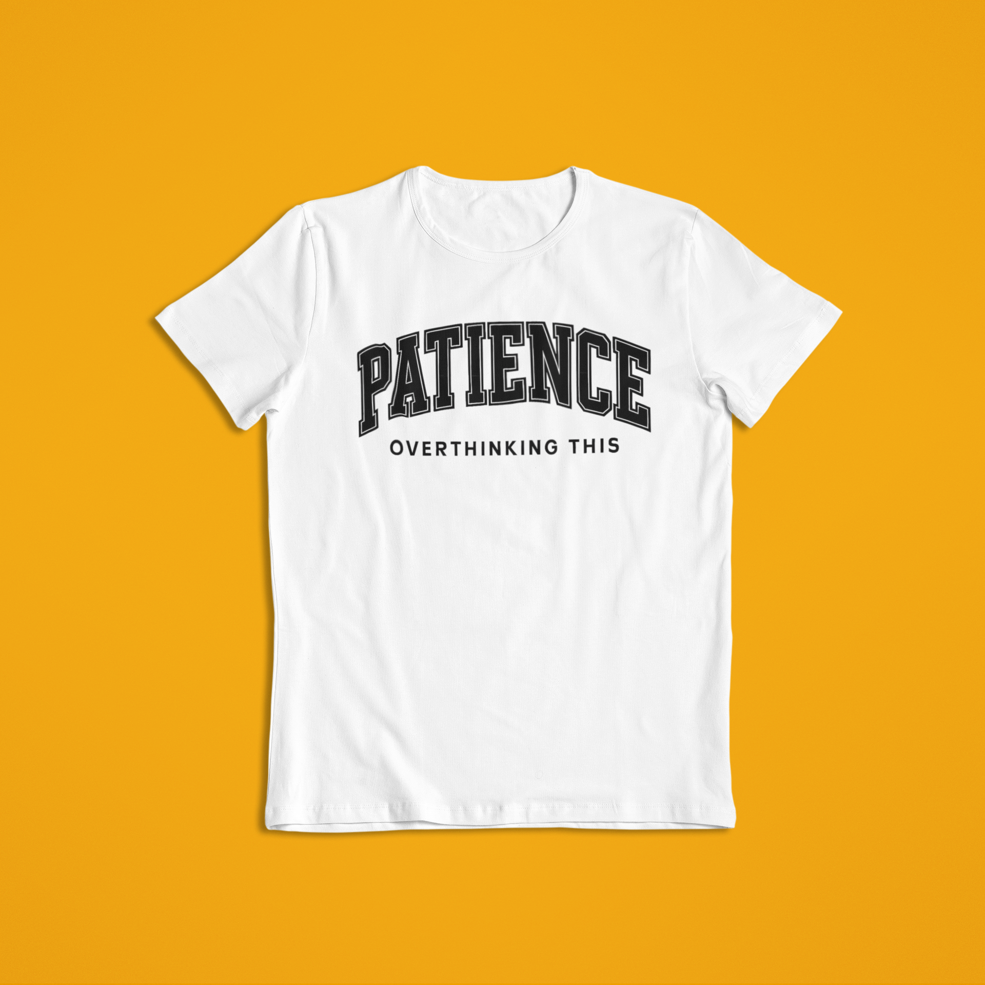 Keep calm and laugh at life’s chaos with this witty minimalist design that reads “Patience – Overthinking This.” Perfect for anyone who overanalyzes everything but still keeps their sense of humor!