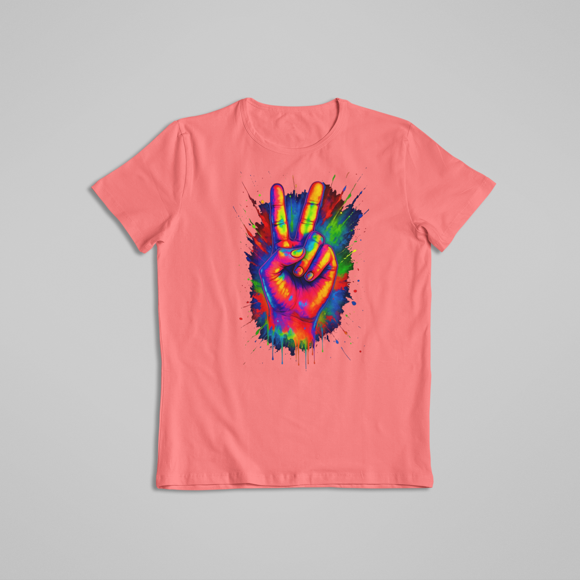 Spread peace, color, and creativity with this stunning Rainbow Peace Sign design! Featuring a bold hand gesture surrounded by bright neon splashes and dripping paint effects, this graphic brings energy and positivity to every outfit.