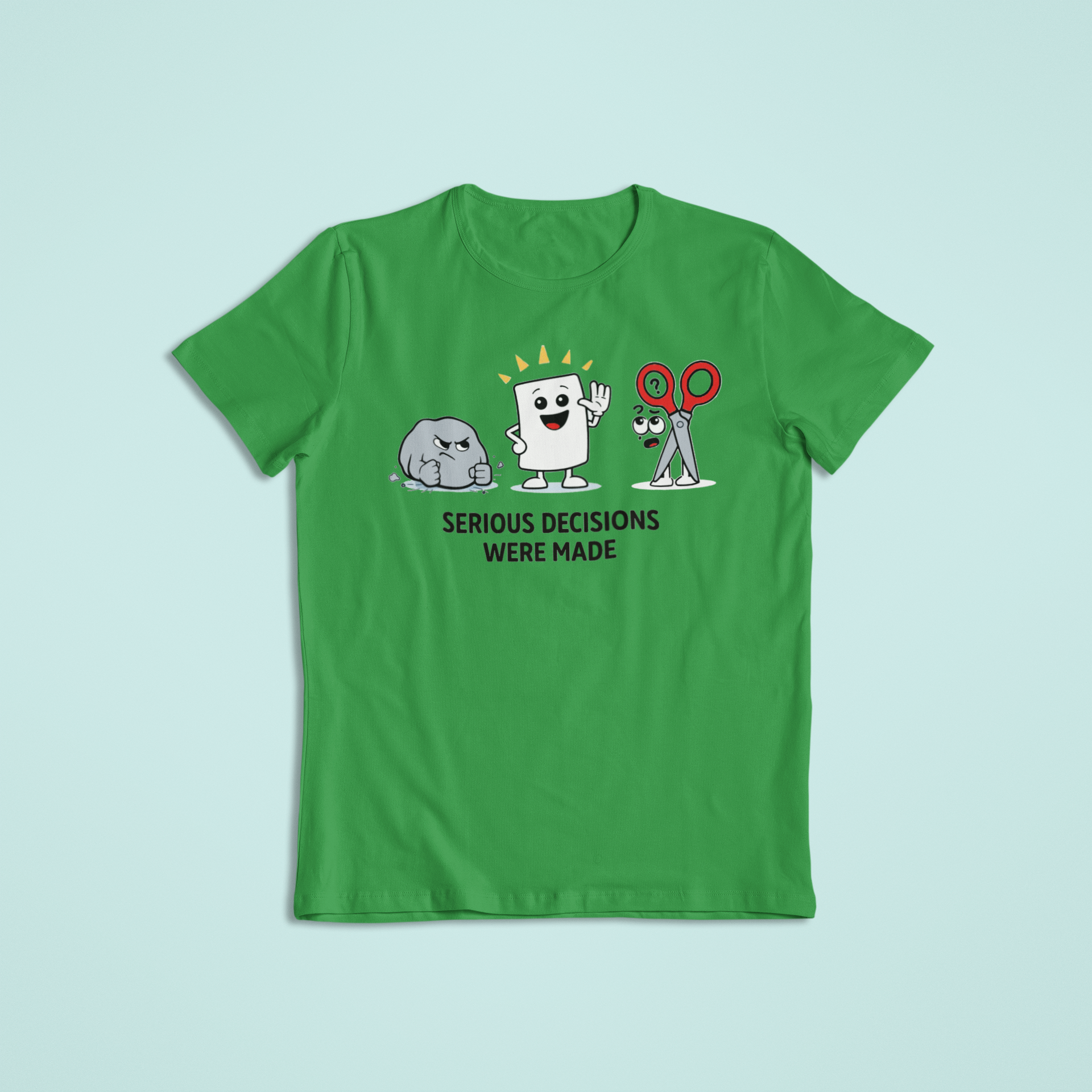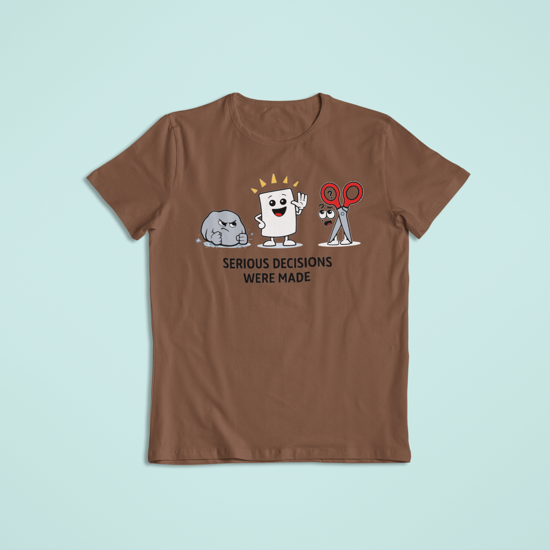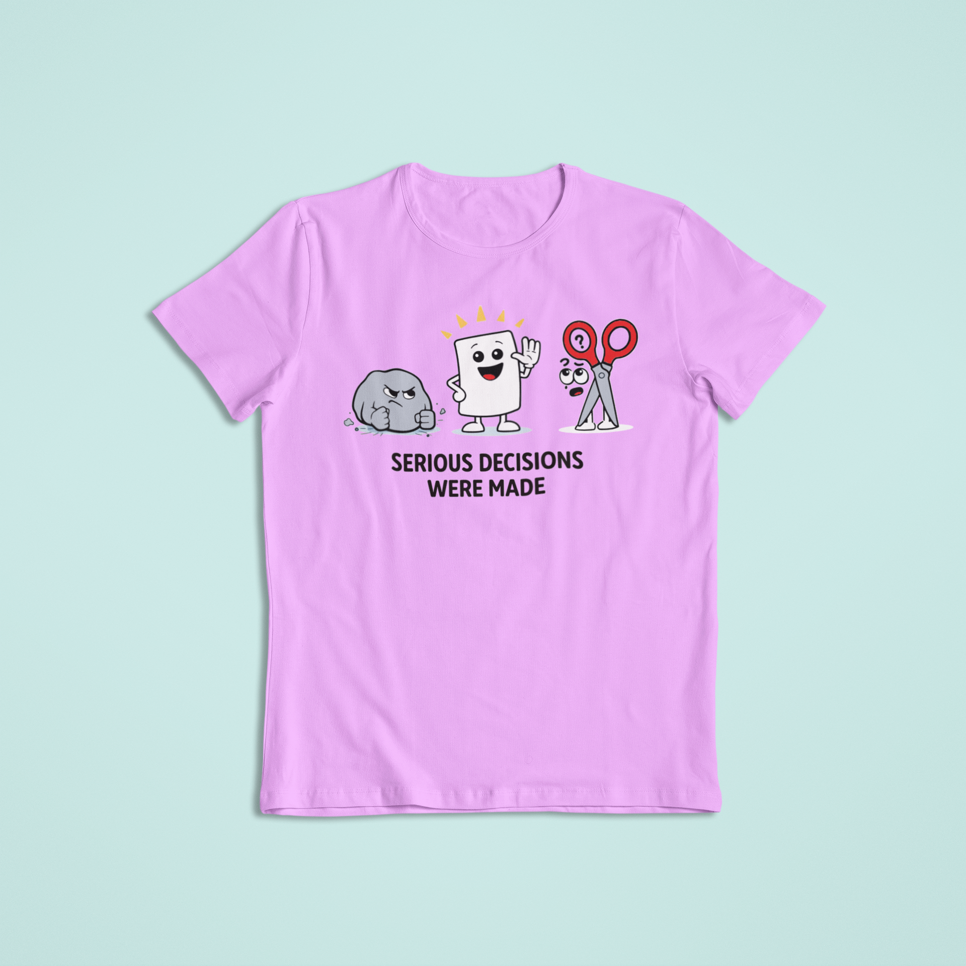This funny graphic design features playful cartoon characters inspired by the classic Rock-Paper-Scissors game, making it perfect for anyone with a sense of humor and an appreciation for everyday sarcasm. Lighthearted, relatable, and conversation-starting, this design is great for casual wear or gifting.