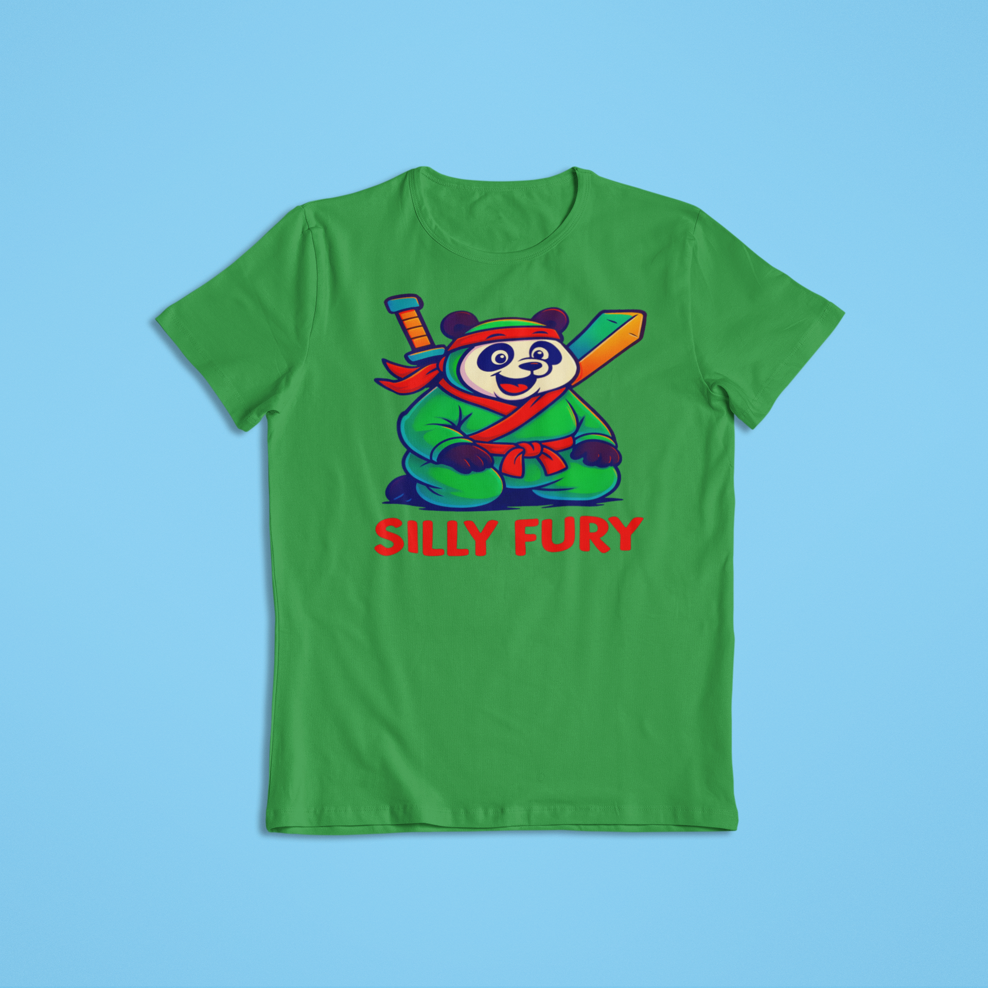 This adorable ninja panda design mixes martial arts attitude with playful, silly charm. Dressed in a bright green ninja outfit with a sword on its back, this happy panda brings fun and color to any outfit. Perfect for kids, teens, adults, martial arts fans, or anyone who loves funny animal graphics!